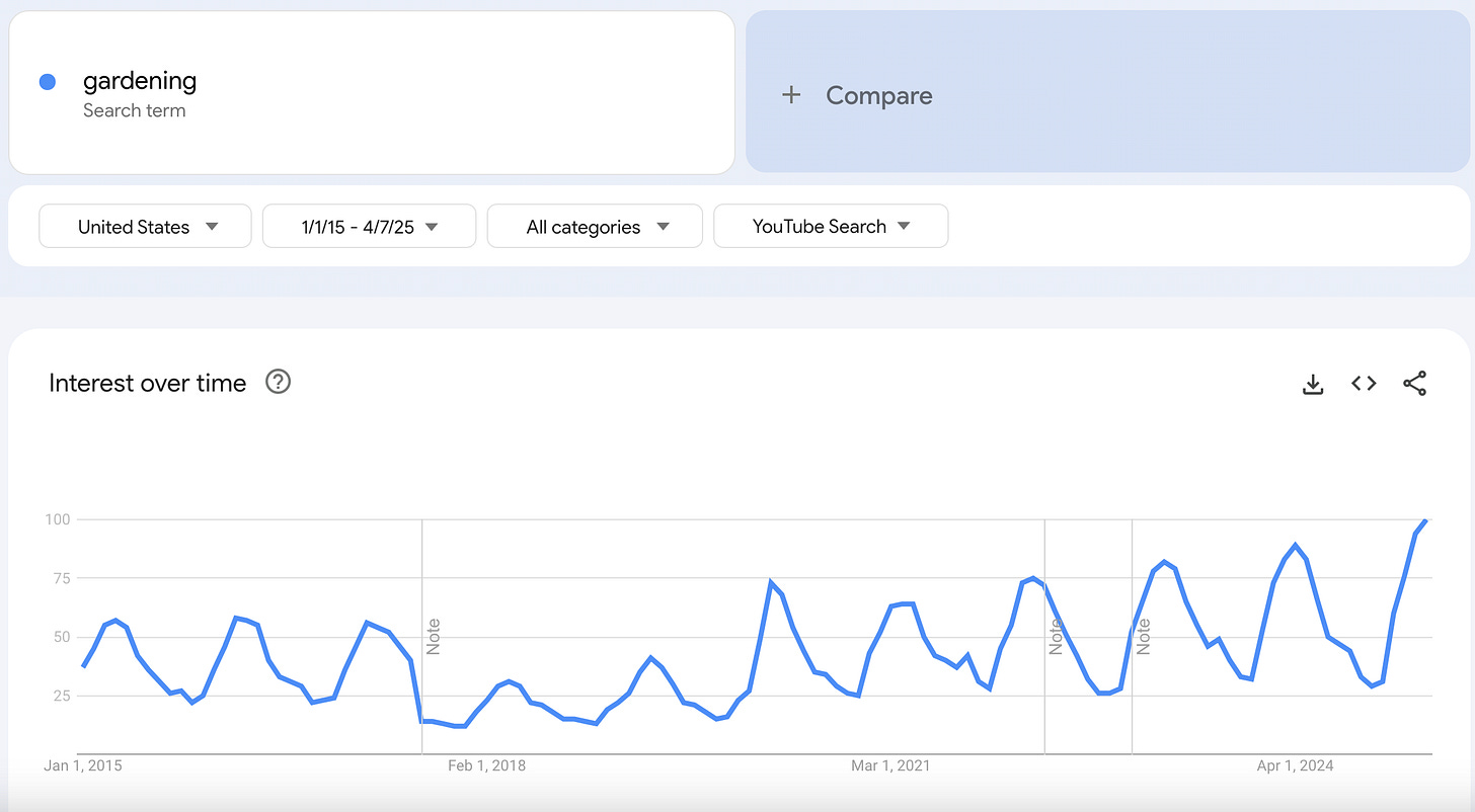 April campaign timing: Given gardening is seasonal, April is the peak time of year people are looking for information, as you can see from Google Trends YouTube search spikes in the past decade.