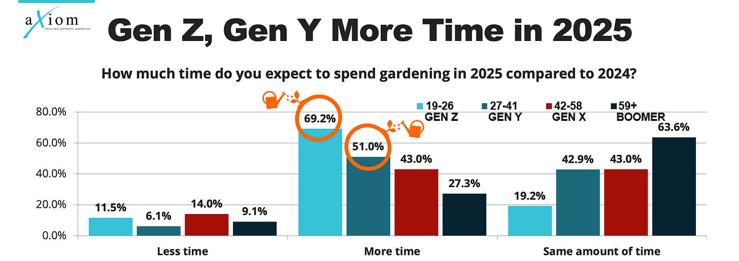 Let’s dig into the data. A few notes on the sources: there are not a ton of great reports on the gardening industry itself as gardening is often lumped with Lawn, which is quite expansive (Statista report here). This 2025 Axiom Gardening report is helpful but you have to read it with a close eye because 1. it’s self-reported and 2. it doesn’t actually give a lot of overarching stats, just YoY change in stats. If you’re an IGC (Independent Garden Center), this report is for you. This Bigger Garden report is helpful, just note it’s from 2023.